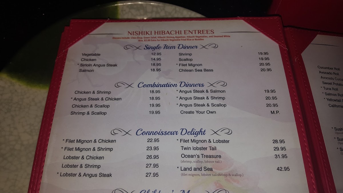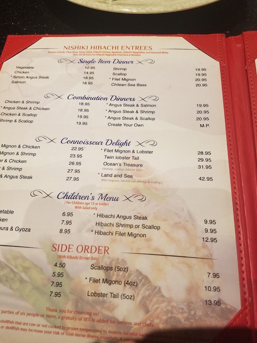 Tender filet mignon with shrimp. Choose meat temperature: rare to well done. Sides: noodles, vegetable and egg fried rice, or white rice.